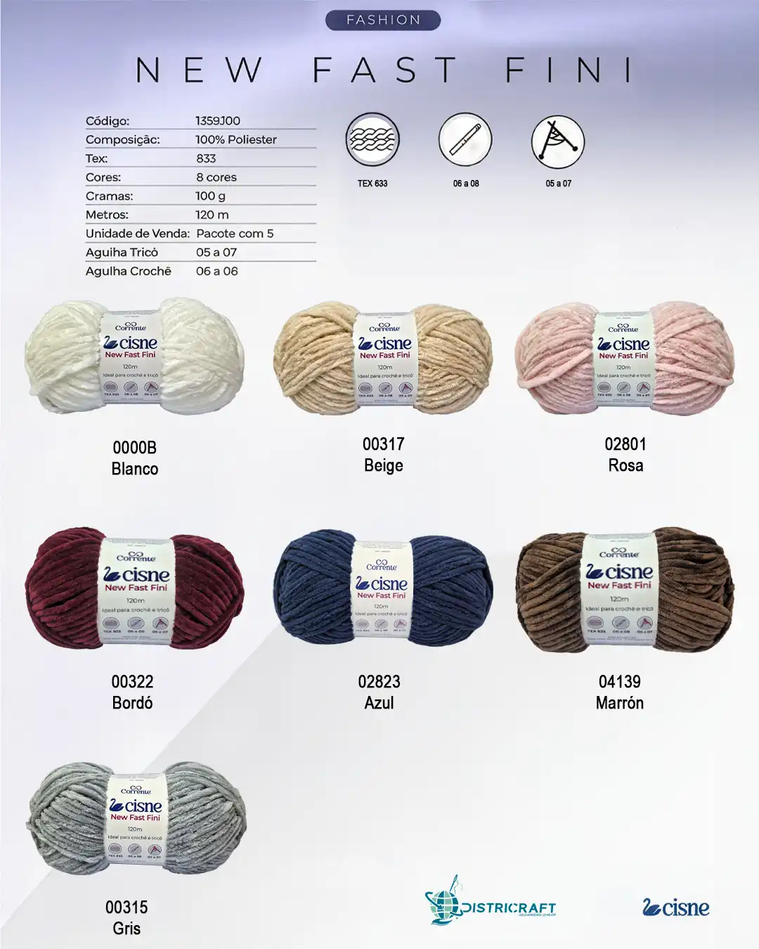 Cisne New Fast Fini es un hilado tipo chenille que se destaca por su textura aterciopelada, ideal para crear prendas y accesorios con volumen, suavidad y un estilo moderno.