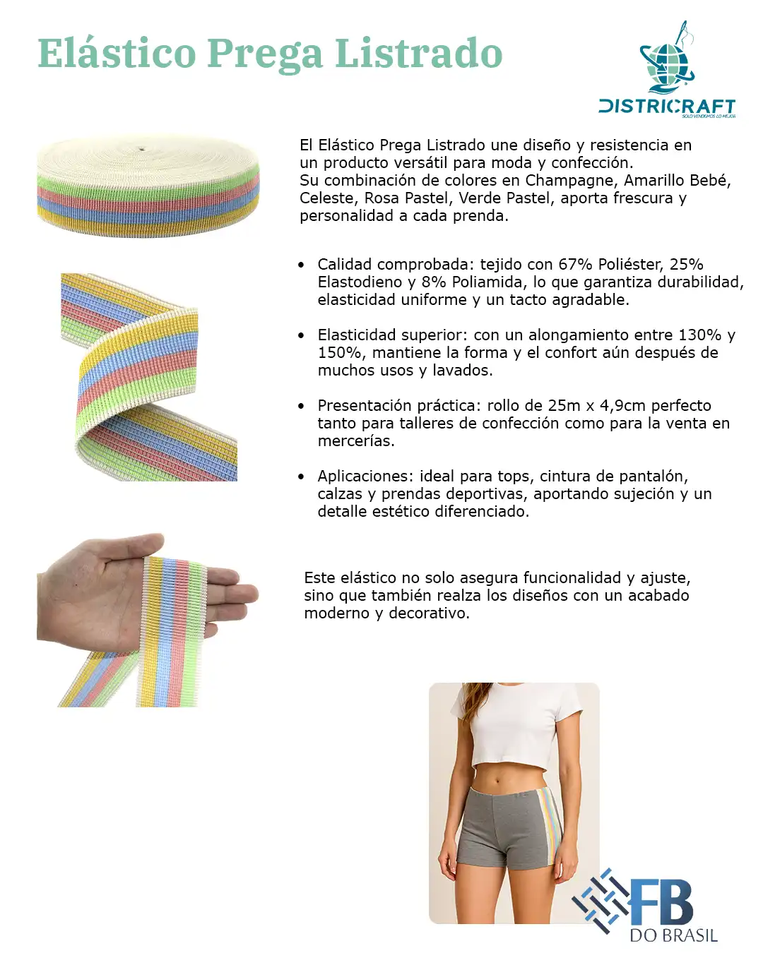 Perfecto para tops, calzas, pantalones, shorts y prendas funcionales, este elástico asegura sujeción cómoda y un look moderno en cada proyecto. Se presenta en rollos de 25 metros y trabaja con una elasticidad balanceada del 130% al 150%, garantizando resultados profesionales.